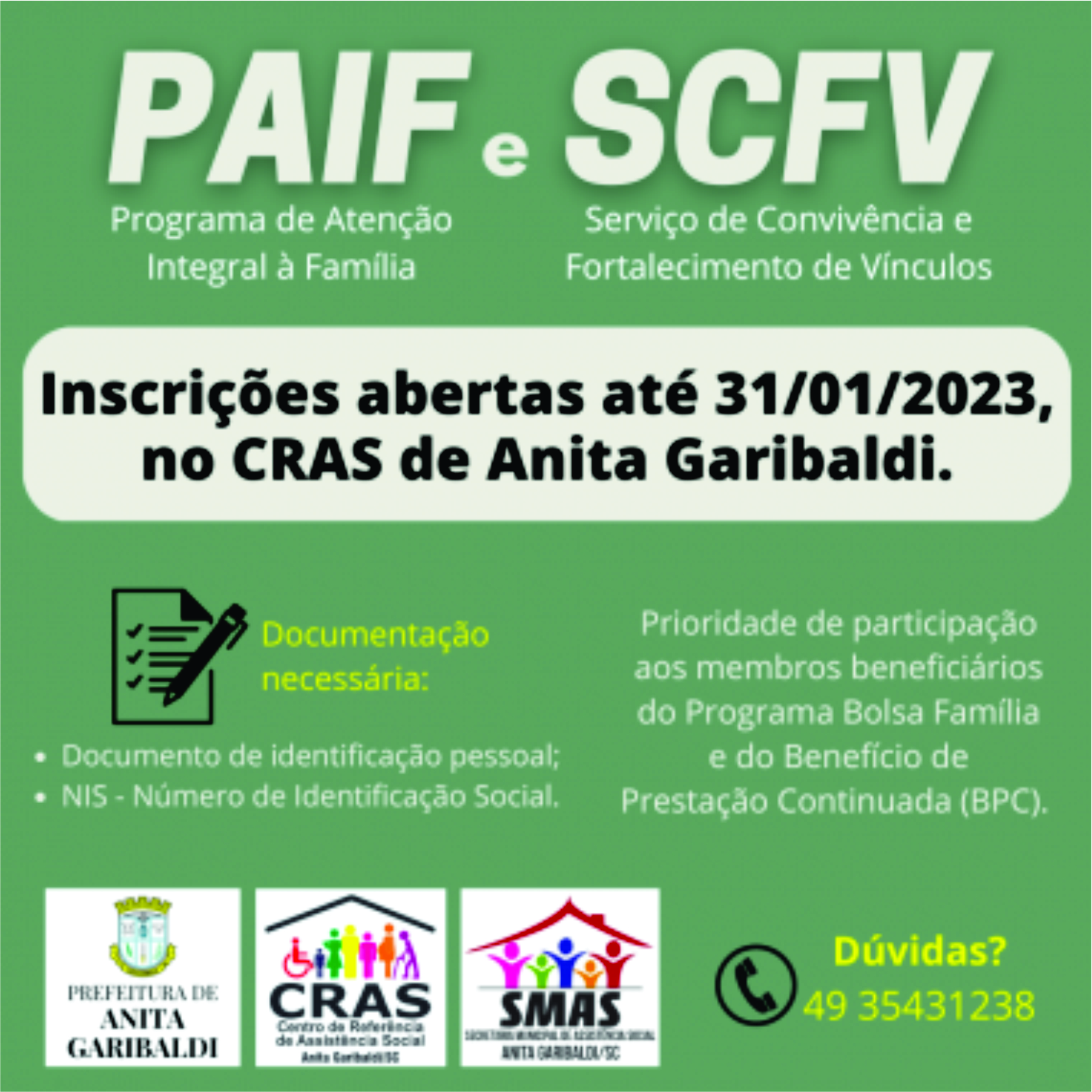 Até o dia 31/01/2023 estão abertas as inscrições para participar dos grupos do PAIF - Programa de Atenção In...